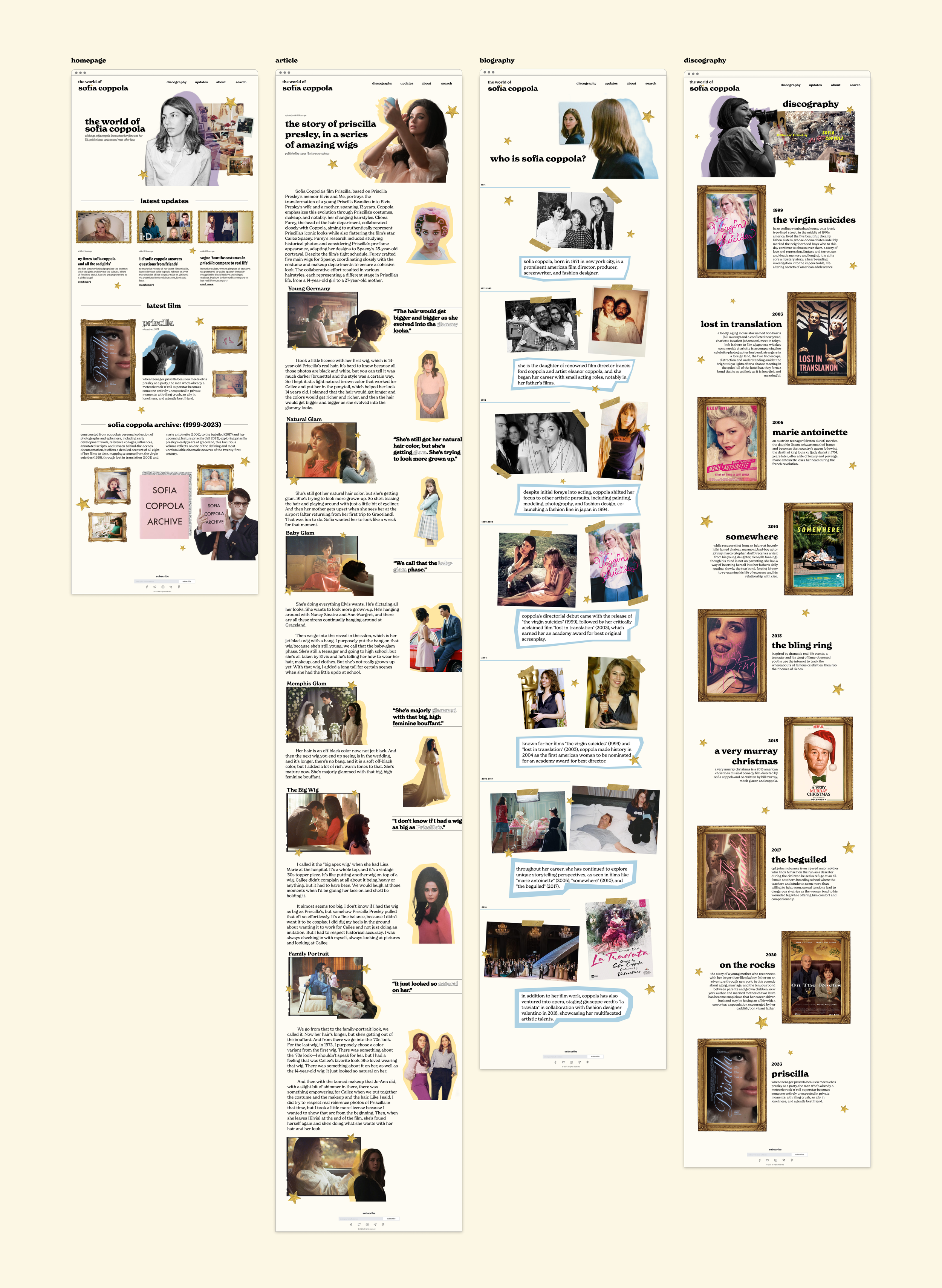 My goal for the website was to create a space that both celebrates Coppola’s work and reflects the aesthetic qualities that define her films. I designed the interface with a focus on clean navigation and a soft, minimal visual language that mirrors the dreamy, contemplative tone often present in her movies. The project allowed me to explore how UI design can translate the mood and identity of a filmmaker into a digital experience, while also highlighting her filmography and creative influence.